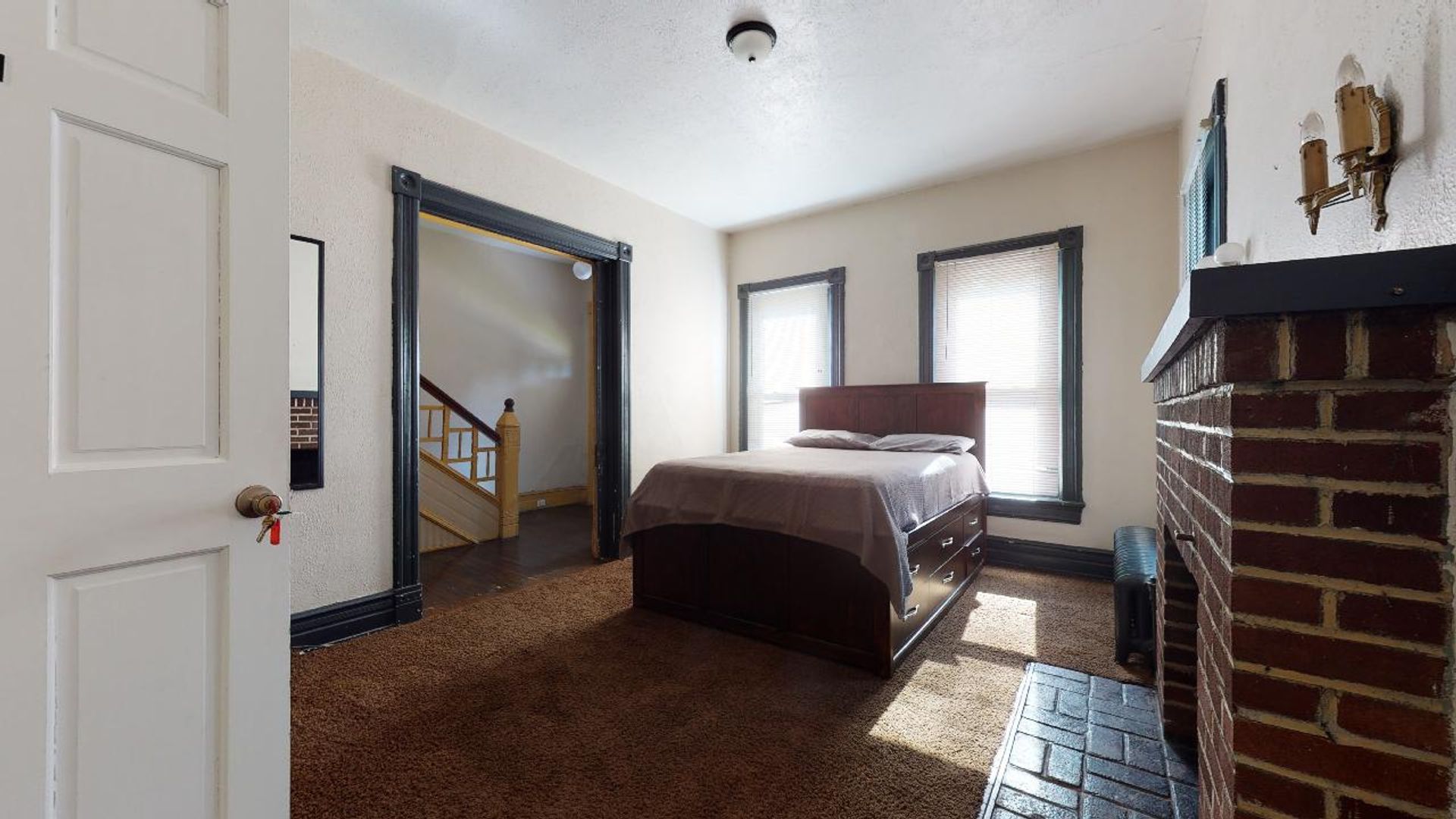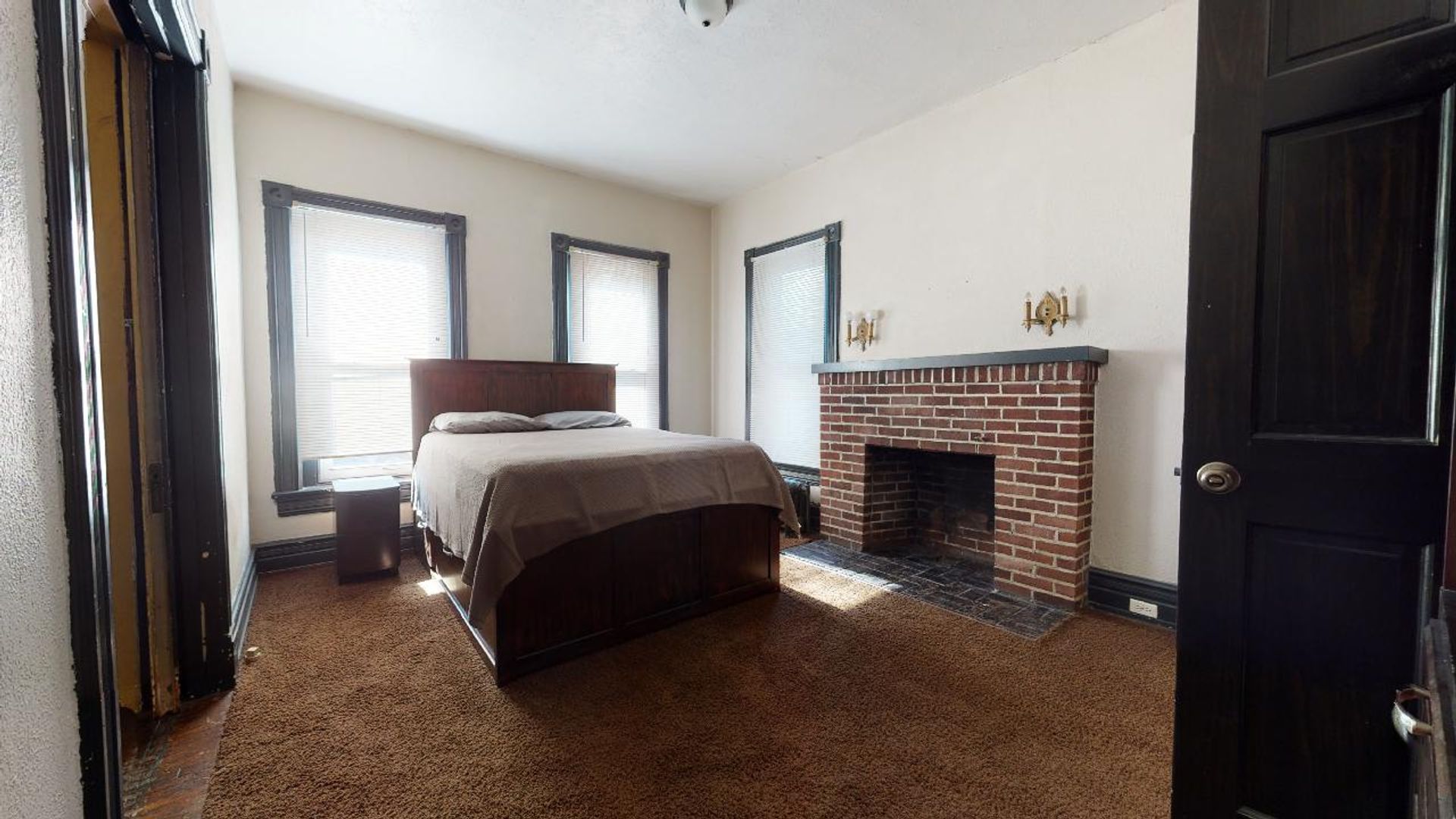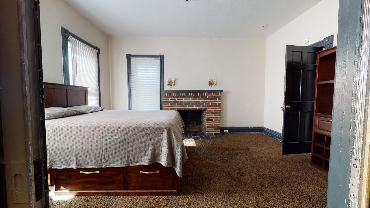 Bedroom 1: First floor bedroom (11.11 x 16.2) with queen size bed and non-operating fireplace.