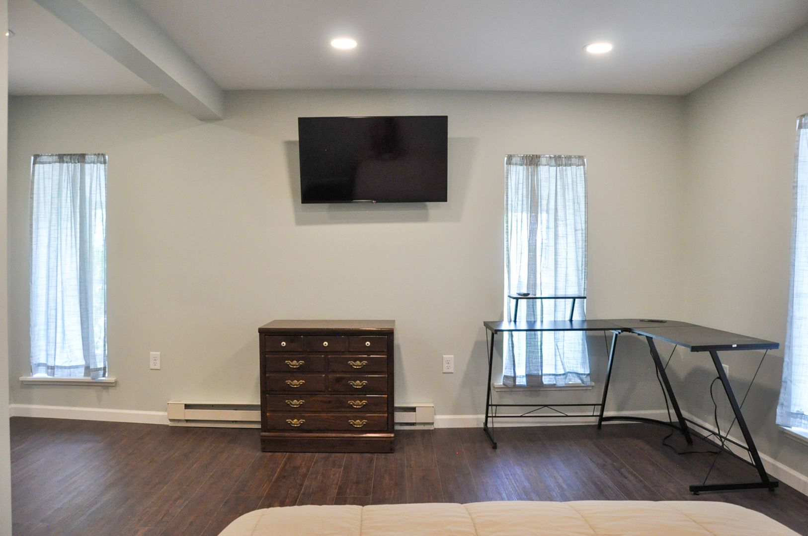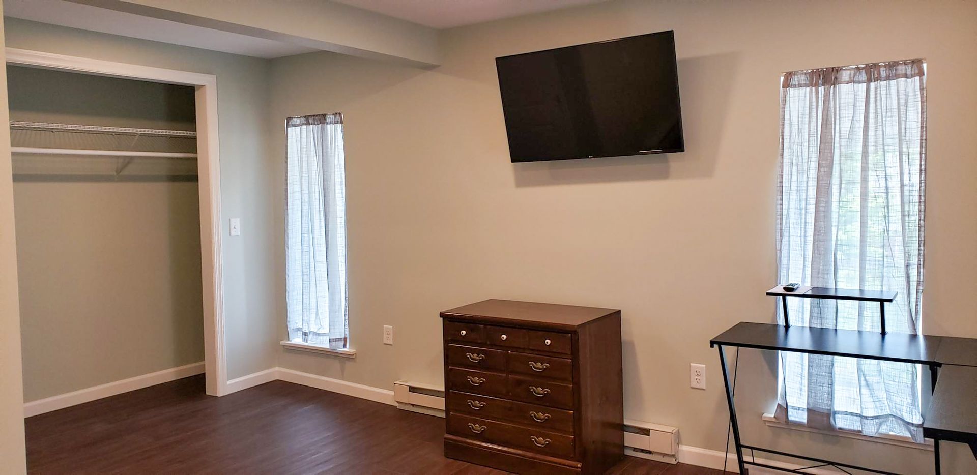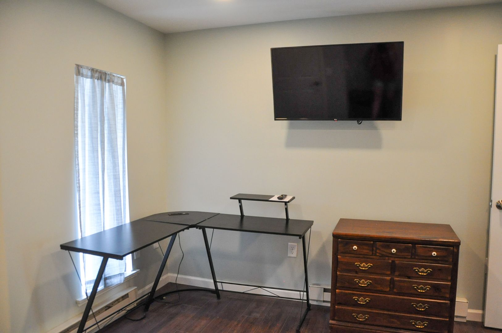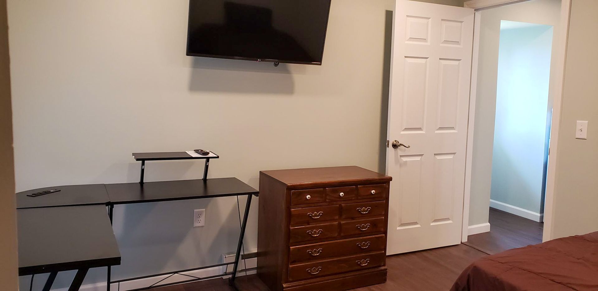 Bedroom 1: (15' X 17' 7") located in the front of the apartment facing Grier Street and furnished with a full-size bed, night stand, dresser, desk/chair and wall-mounted, flat-screen tv