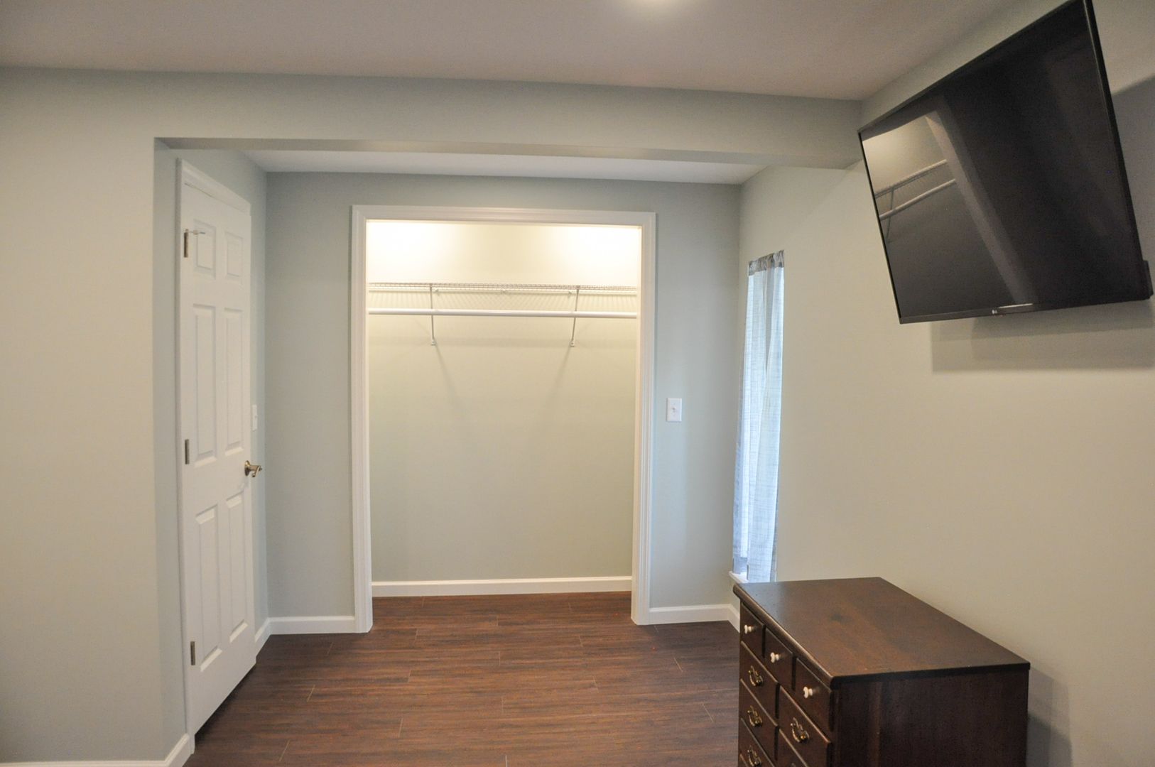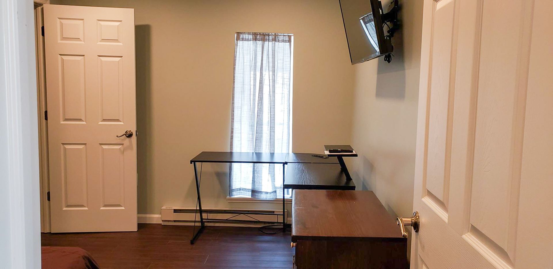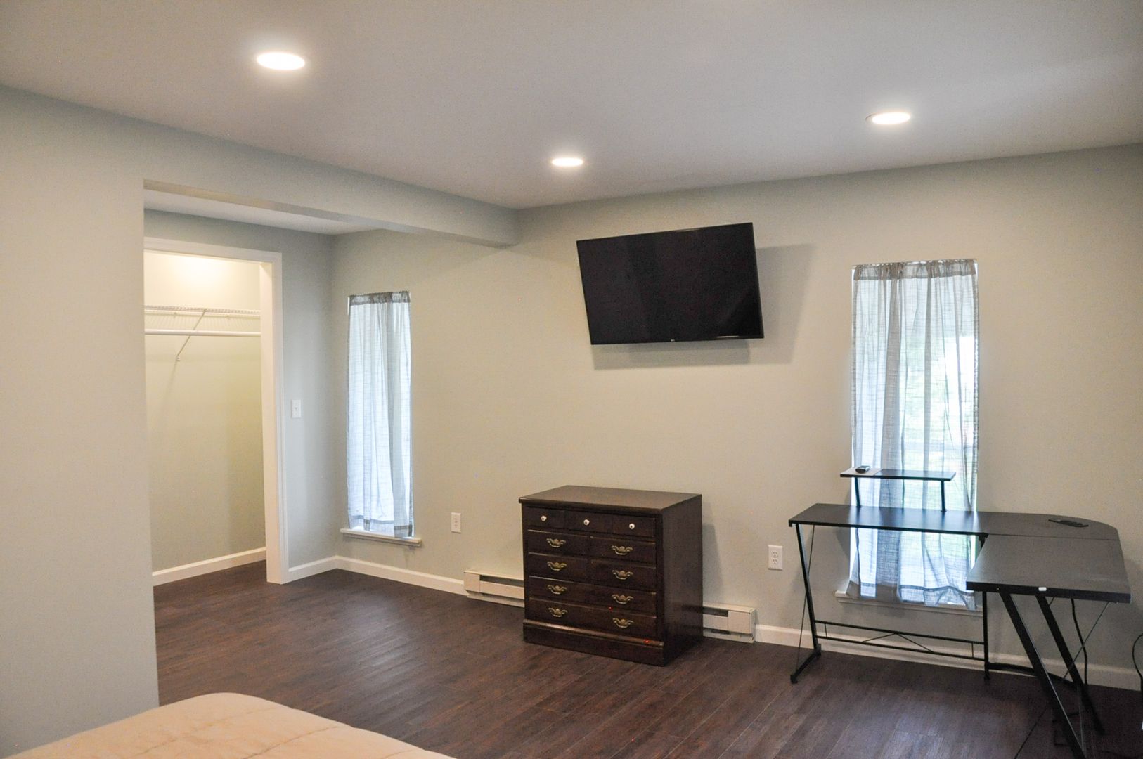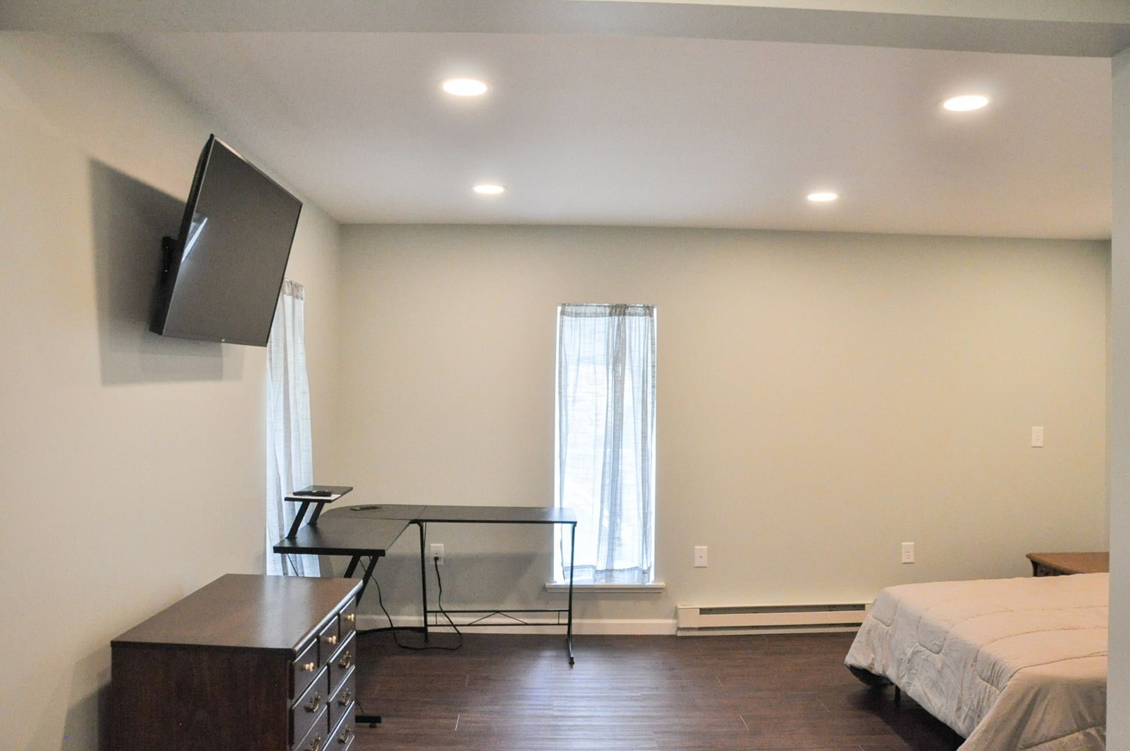 Bedroom 1: (15' X 17' 7") located in the front of the apartment facing Grier Street and furnished with a full-size bed, night stand, dresser, desk/chair and wall-mounted, flat-screen tv