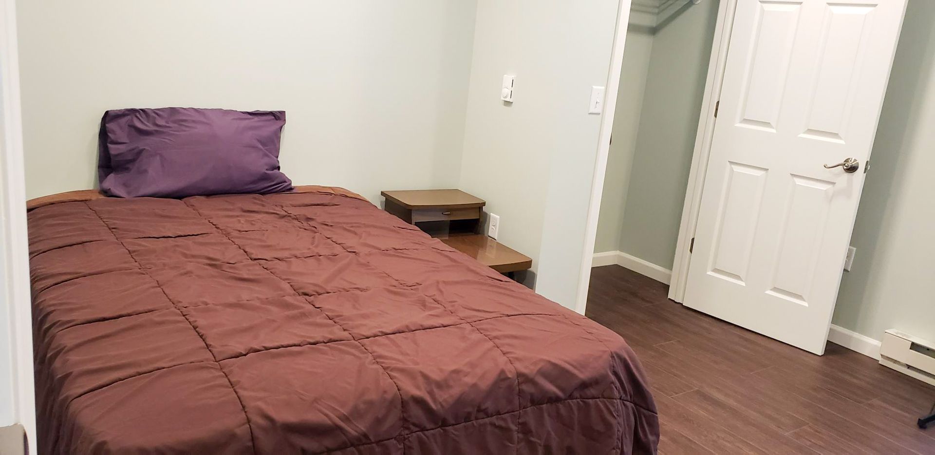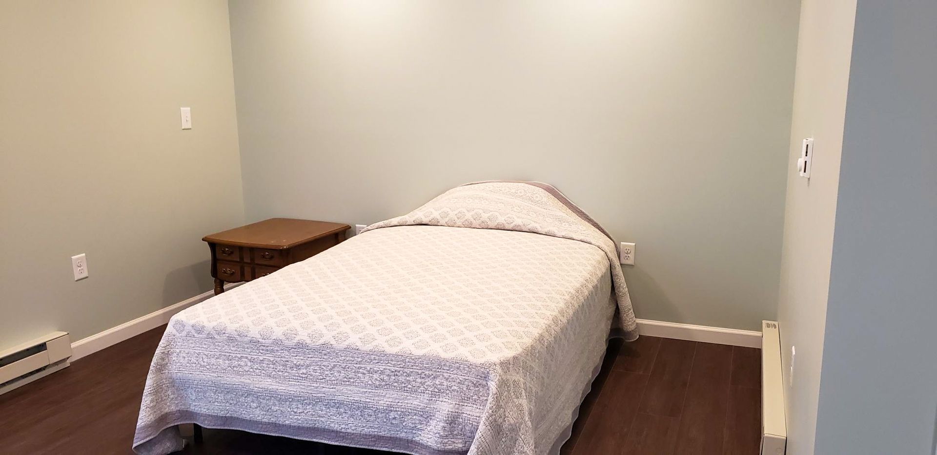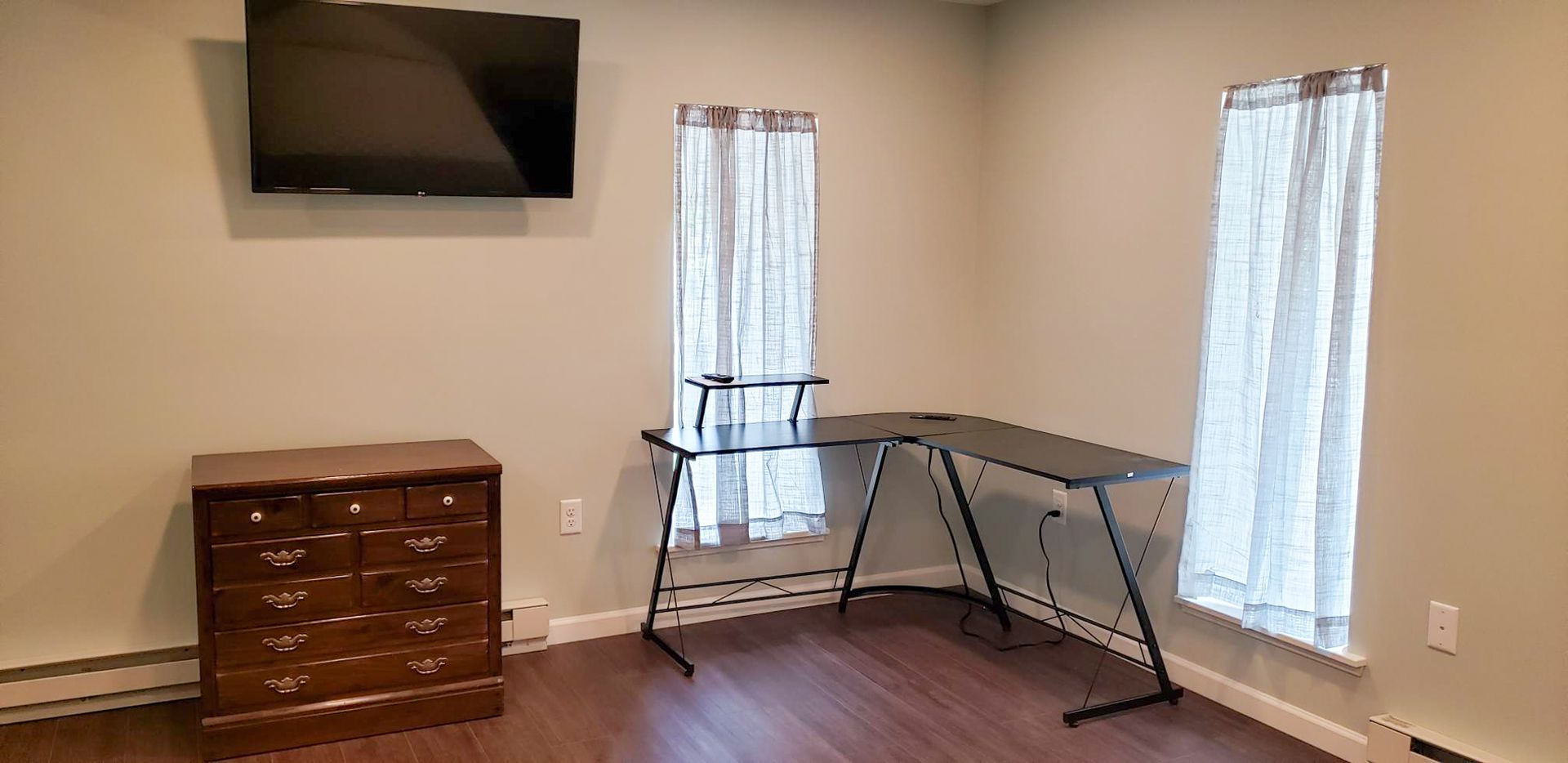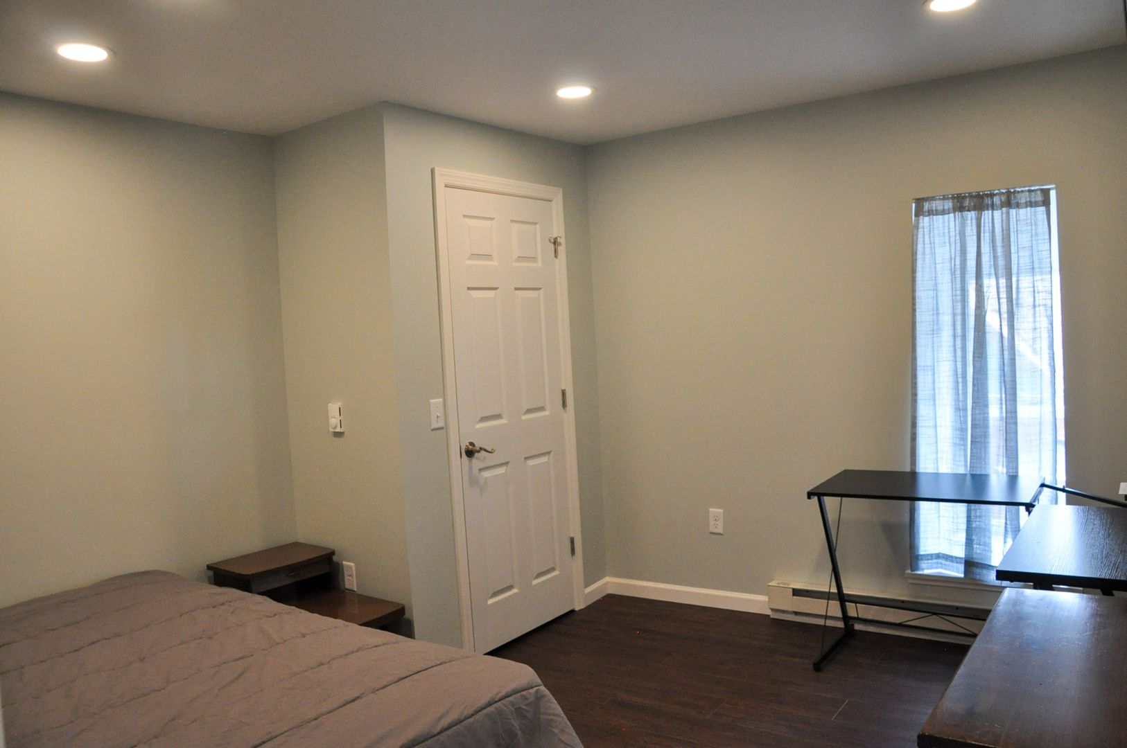 Bedroom 1: (15' X 17' 7") located in the front of the apartment facing Grier Street and furnished with a full-size bed, night stand, dresser, desk/chair and wall-mounted, flat-screen tv