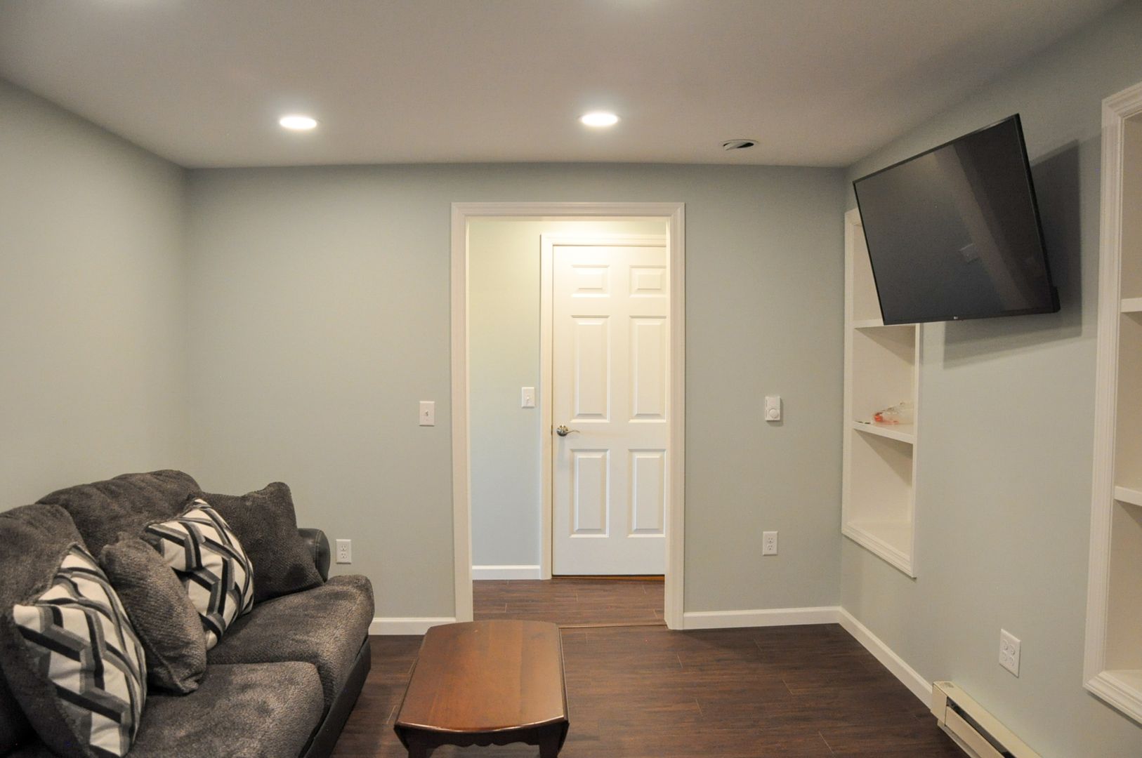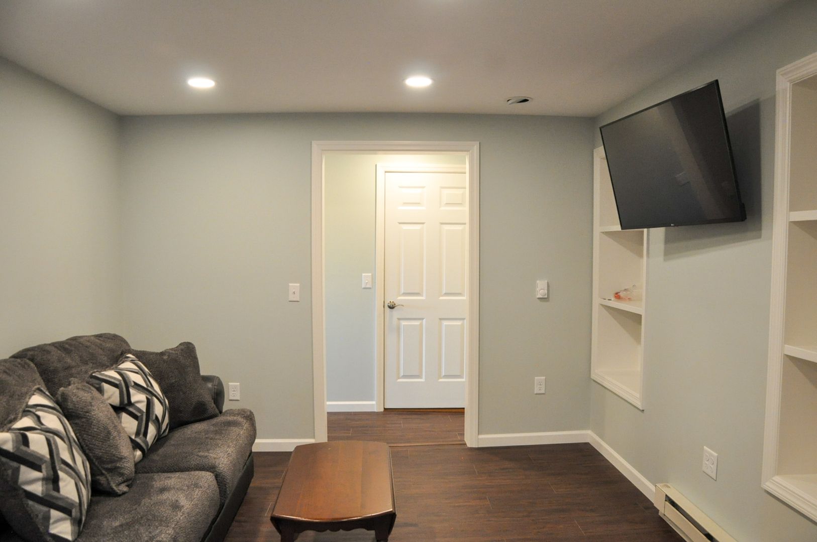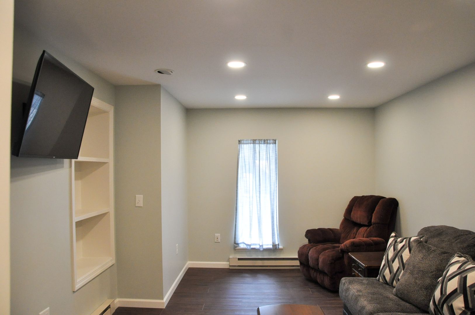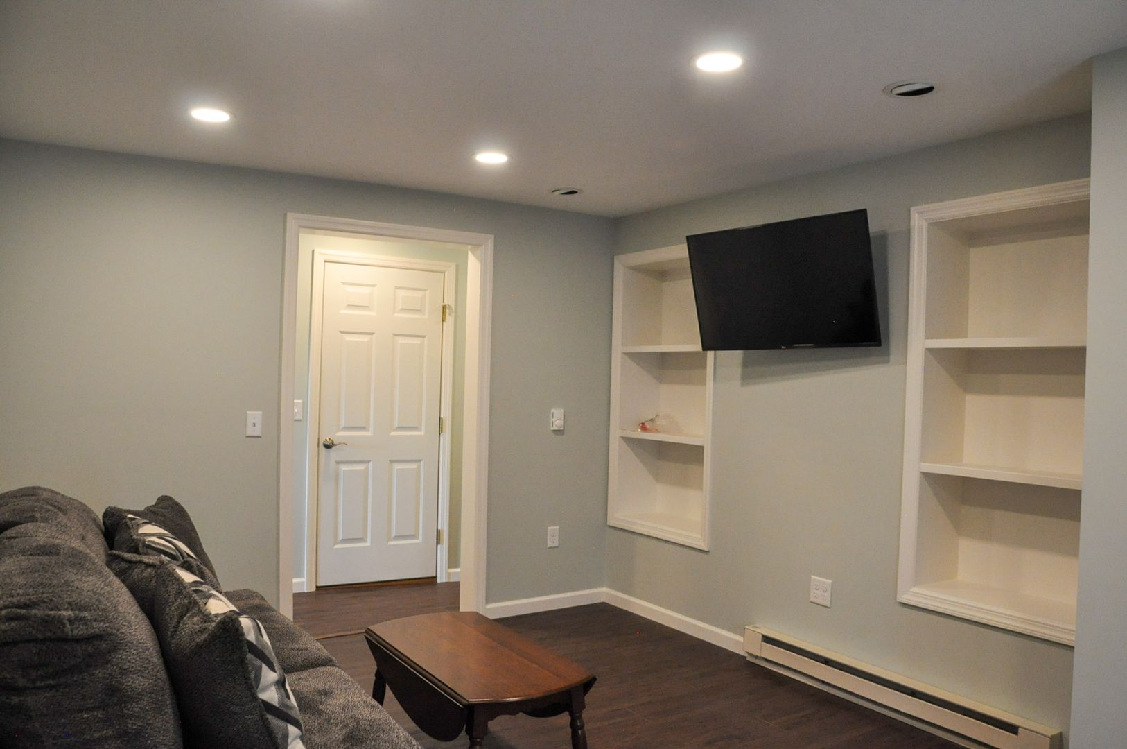 Living room: (10' 10" X 15' 3") includes sofa, recliner, coffee table, end table, built-in-book cases and wall-mounted, flat-screen tv