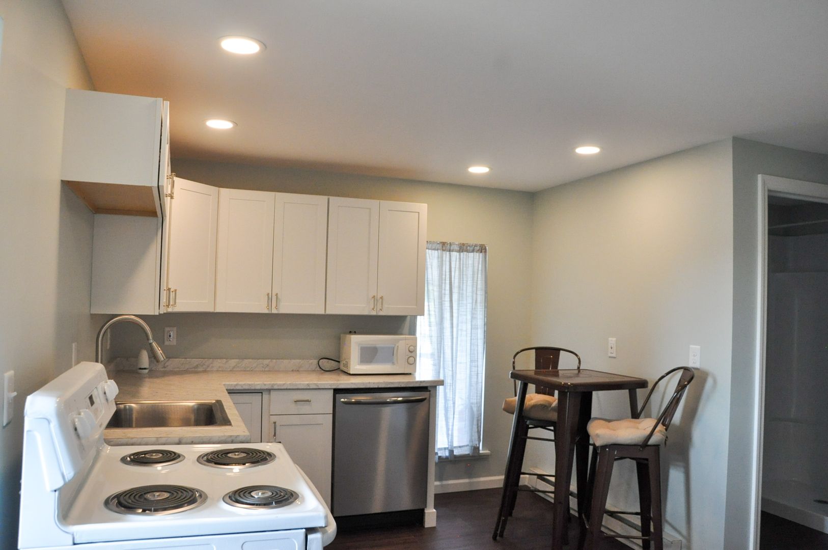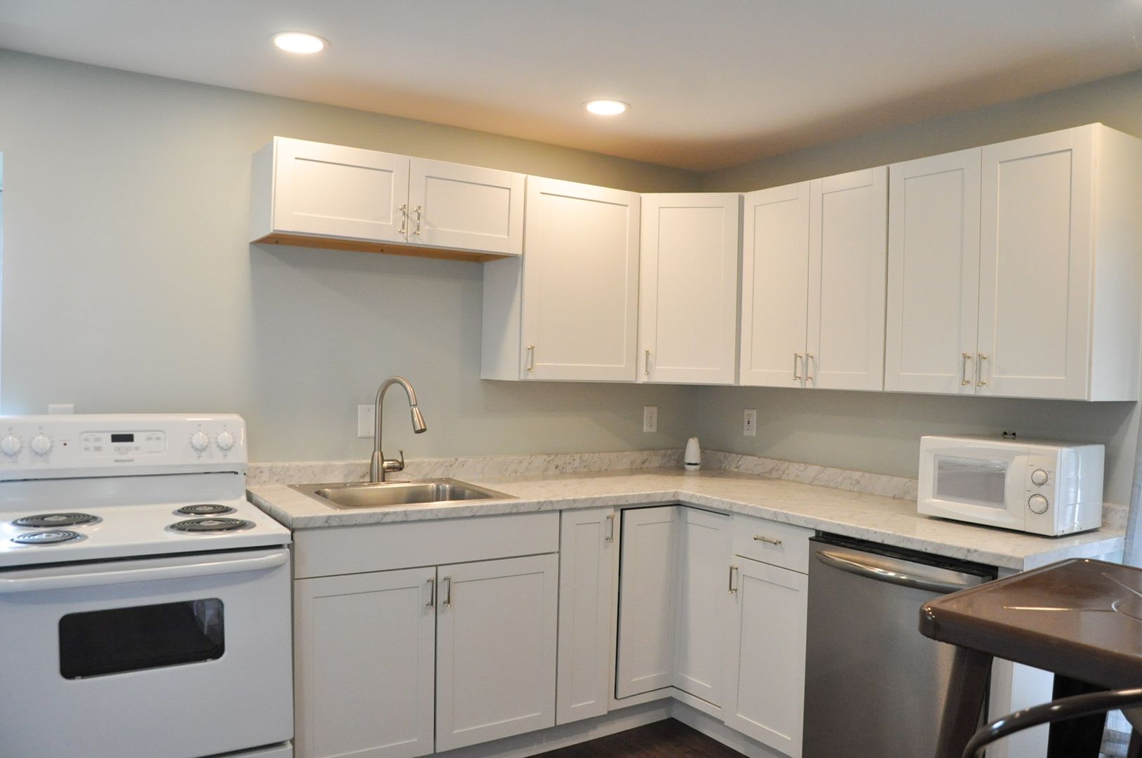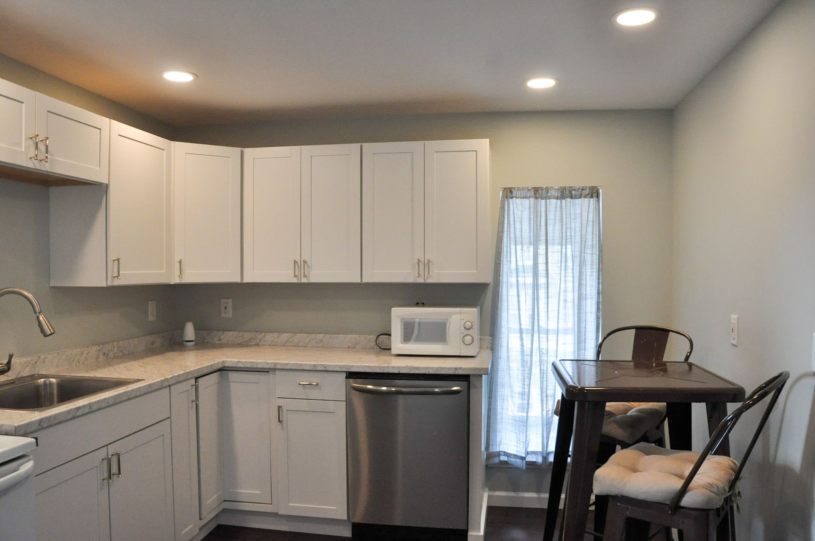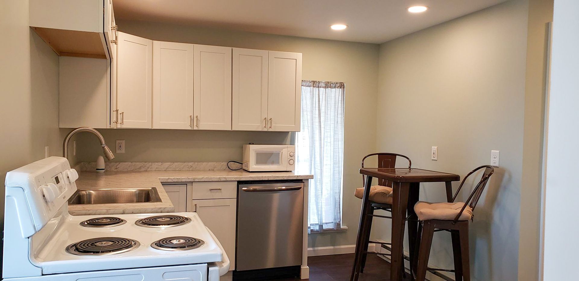 Kitchen: (13' X 11' 4") with brand-new, white cabinets and granite countertops includes range, refrigerator, dishwasher, microwave and table for two