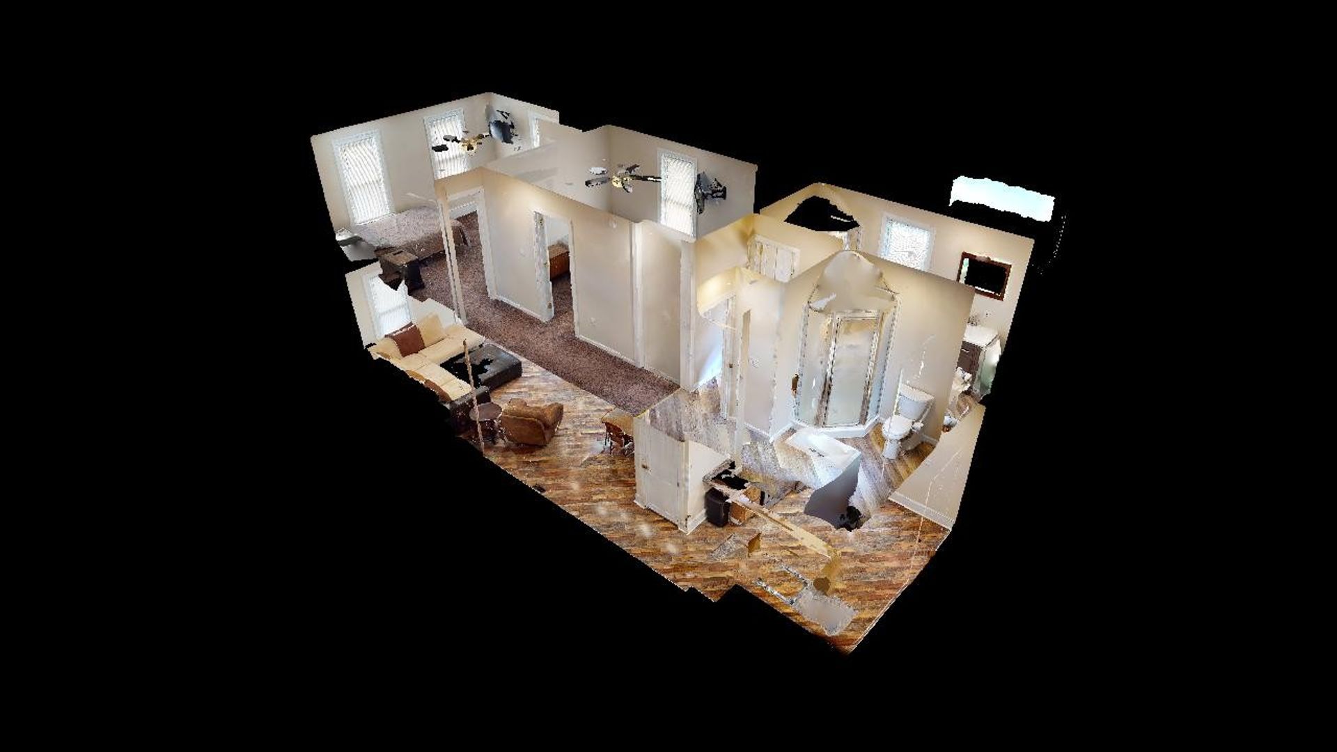 Living room/dining area: (22' 5" X 13' 1") includes sectional with ottoman, recliner, desk/chair, entertainment center, end table, dining table/chairs and wall-mounted flat-screen tv.